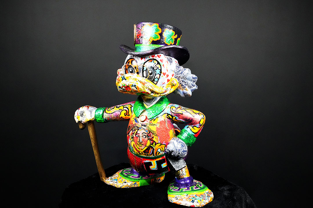 “Fashion Scrooge” by Art by Son is a one-of-a-kind mixed media sculpture that features an original Disney figure from circa 1970, hand-painted and adorned in fashion clothing, with a hat, cane, and a bag featuring the euro symbol on the left side. This 52cm sculpture is a truly unique work of art that combines elements of classic Disney with modern luxury fashion.